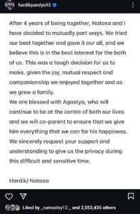 જોકે, આ બધા વચ્ચે હાર્દિકે દીકરા અગસ્ત્યની દેખરેખ કોણ કરશે એ બાબતે પણ ખુલાસો કર્યો હતો. હાર્દિકે અગસ્ત્યને લઈને પોતાની પોસ્ટમાં લખ્યું છે કે અગસ્ત્યને અમારા જીવનમાં મેળવીને અમે લોકોએ ખુબ જ ખુશી અનુભવીએ છીએ. એ હમેશાં અમારા જીવનનો એક અભિન્ન અંગ રહેશે અને અમે બંને સાથે મળીને એની દેખરેખ કરીશું. એની ખુશી માટે અમે જે પણ બની પડશે એ બધું જ કરીશું. અમે આશા કરીએ છીએ કે અમને તમારો સાથ સહકાર મળશે. તમે આ મુશ્કેલ સમયમાં અમારી પ્રાઈવસીનું મૂલ્ય સમજી શકશો.